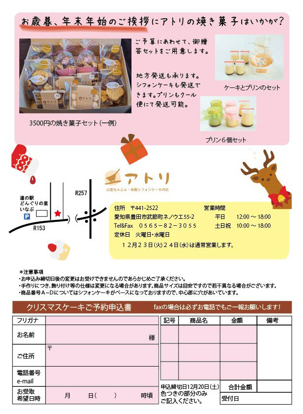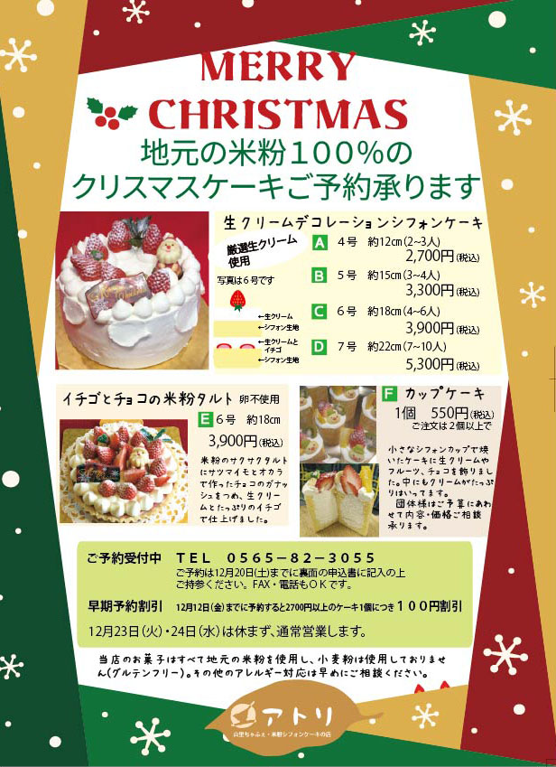 2025.12.02 クリスマスケーキの予約受付中 今年もクリスマスケーキの予約をはじめました。 早期予約割引もありますのでお早めにどうぞ。 クリスマスケーキご予約承ります 最新のお知らせお知らせ一覧 2024.12.16 クリスマスケーキご予約承ります 2024.12.14 名古屋金山駅にて販売 2024.01.16 名古屋金山駅1カ月限定アンテナショップ 2023.12.04 電話番号が変更になりました 2023.08.11 お盆期間営業します!